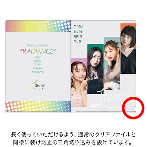 ※長く使っていただけるよう、通常のクリアファイルと同様に裂け防止の三角切り込みを設けています。